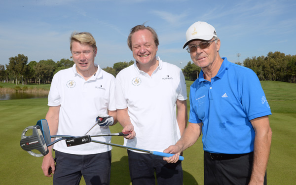 Tuniertag 2: Mika Häkkinen spielt zusammen mit Hanjo Schneider (Hermes Chef ) und Franz Beckenbauer. Foto: SchneiderPress, Wolfgang Breiteneicher