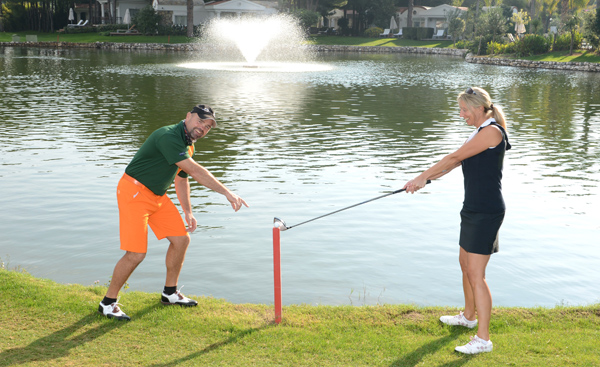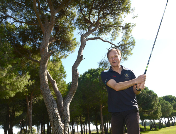 Tony Christie golfte tagsüber und stand abends auf der Bühne. Hier mit Sonja Zietlow und Maxi Arland auf der Driving-Range. Foto: SchneiderPress, Wolfgang Breiteneicher