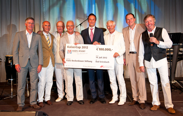 Der 25. KaiserCup im Hartl Resort vom 13. bis 15. Juli war zweifelsohne ein ganz Besonderer: zum runden Jubiläum kamen sogar die Fußball-Nationalspieler Bastian Schweinsteiger und Holger Badstuber per Helikopter eingeflogen. Schon beim bayerischen Auftakt im Hotel Maximilian mit großer Tombola und Golf-Turnier am Folgetag zugunsten der Franz Beckenbauer Stiftung ließen sich die rund 400 Gäste nicht lumpen und gaben so viel Geld aus, dass Volker Schwartz, Geschäftsführer vom Hartl Resort, am Samstagabend Franz Beckenbauer einen Scheck in Höhe von 100.000 Euro überreichen konnte. Die Highlights in Bildern!