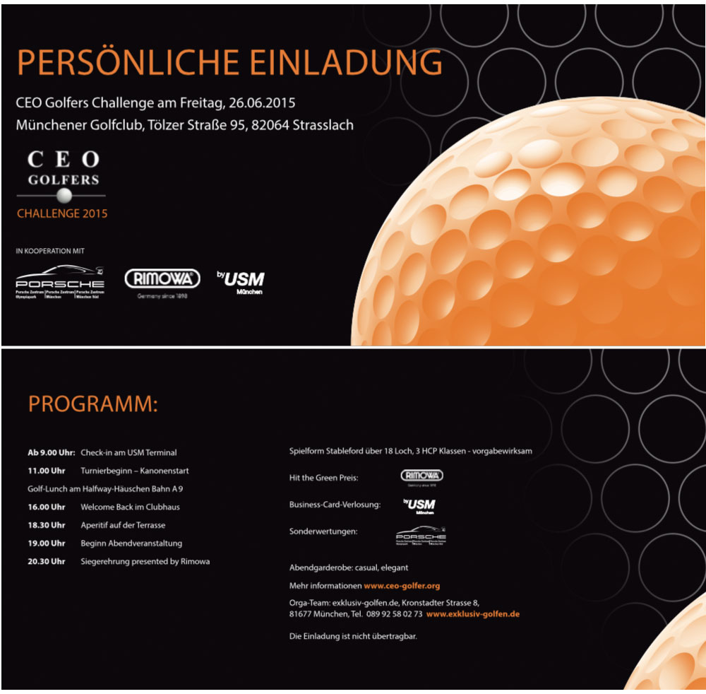 Bereits zum sechsten Mal findet der CEO Golf Cup, ausgetragen vom Golfportal exklusiv-golfen.de statt. Nach 5 Jahren der exklusiven Partnerschaft mit Lufthansa, im sechsten Jahr erstmalig ohne die Flugbegleitung der Lufthansa. Wir danken Lufthansa für die Treue und die tolle Zusammenarbeit über mehr als 5 Jahre. Neu an Board begrüssen wir USM als Markenpartner. Somit begleiten drei Design Ikonen den exklusiven Business Golf Networking Event: Porsche, Rimowa und USM.
