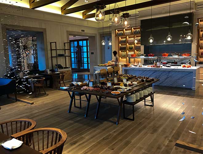 Frühstück gibt es für Frühaufsteher bereits ab 7 Uhr und es wird im Restaurant Balearic serviert, welches sich am Dorfplatz befindet. Abends öffnet das Restaurant nur in der HighSeason, somit konnten wir hier nur Frühstück genießen. Das Speisenangebot richtet sich nach den Jahreszeiten und dem saisonalen Angebot. Brot wird hier selbst gebacken und auf der Frühstückskarte stehen Lieblingsspeisen wie Blaubeer-Pancakes oder ‚White Egg Omelette‚, die für die anstehende Golfrunde eine perfekte Grundlage bieten.