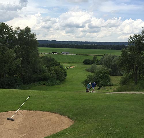 1994 gegründet liegen die 18 Löcher des Golfclubs Memmingen Gut Westerhart im Allgäuer Voralpenland. Normalerweise ist hier alles flach, bis auf die beiden Löcher 14 und 15. Zuerst geht es für ein Par 4 steil bergab bis es dann für ein Par 3 wieder mächtig den Berg hoch geht (s.Bild). Hier darf man nicht zu weit sein, denn hinter dem Grün ist sofort das AUS. Die Aussicht oben angelangt auf die Autobahn A 96. April 2025 wurden statt ein Tiny Haus gleich zehn Tiny Häuser mit 1 Million €-Investitionsvolumen direkt auf dem Golfgelände gebaut - für Urlaub direkt am Golfplatz. Greenfee-News