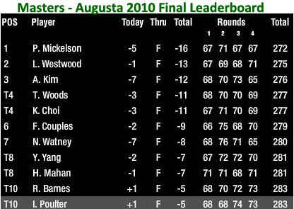 But last but not least war da noch Phil Mickelson – ein Sieger dessen Augusta Story 2010 nicht besser hätte sein können: die beste Runde des Tages am dritten Tag katapultierten ihn in die Spitze – mit zwei Eagles hintereinander wurde er frenetisch gefeiert, eine Schlussrunde 4 am Finaltag ohne ein einziges Bogey und 5 Birdies. Solides Weltklasse Golf gepaart mit seinen persönlichen Schicksalsschlägen (seine Frau und seine Mutter sind an Krebs erkrankt) machten ihn 2010 unter Anwesenheit seiner ganzen Familie zum gefeierten Masters Sieger 2010.