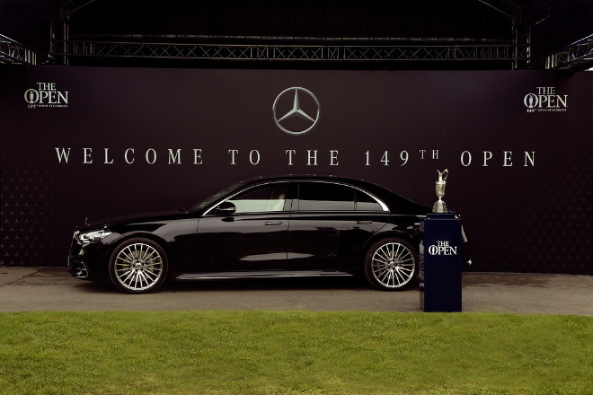 British Open 2021: Der Mercedes-Benz S 500 4MATIC lang (Kraftstoffverbrauch kombiniert: 8,6-8 l/km; CO2-Emissionen kombiniert: 197-183 g/km) beim Return of the Claret Jug. Fotocredit: