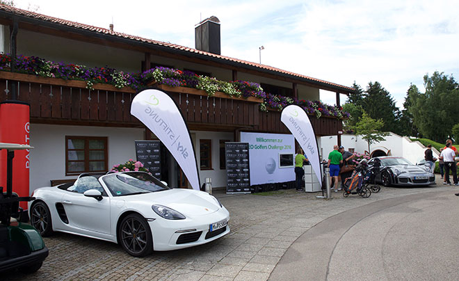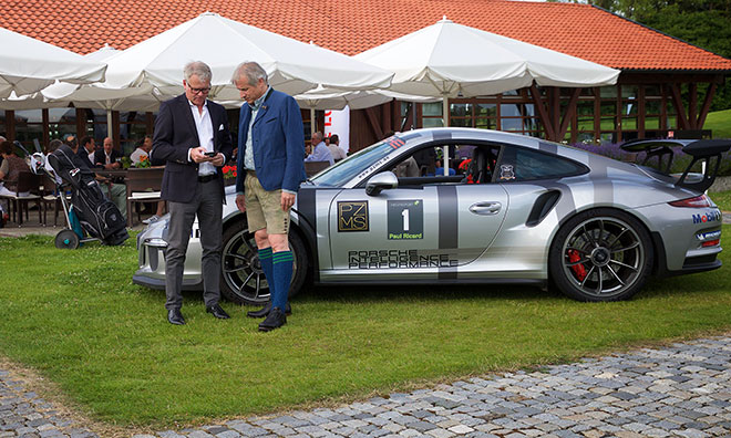 Porsche mit allen drei Münchnern Autohäusern flankiert bereits im fünften Jahr die Fairways mit den aktuellen PS-Boliden. PZM Süd Geschäftsführer Franko Dorow ließ es sich nicht nehmen und begrüßte persönlich die Gäste und überreichte den Gewinnern für die Sonderwertungen ‚Longest Drice’ und ‚Nearest to the Pin’ exklusive Geschenke aus der aktuellen Porsche Accessoire Kollektion.
