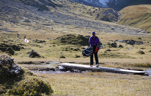 Die Nachricht über einen temporären Golfplatz machte im Oktober unter Golfern die Runde. Auf 1.900 Höhenmetern, wo im Sommer die Kühe weiden, haben die Adelbodener einen urigen 18-Loch-Platz errichtet. Die Naturschützer gaben die Genehmigung für 30 Tage und so mußte man an einigen Stellen improvisieren, denn wer baut schon für 30 Tage extra einen Golfplatz? Einige Golfer belächelten das Projekt als Schnapsidee und so haben wir das Golfgepäck via Bergbahn auf die Engstligenalp transportiert und in luftiger Höhe abgeschlagen. Fazit: Ein uriges Golferlebnis mit ausgezeichneten Aussichten und einem perfekten Höhentraining!