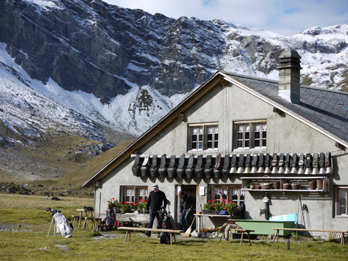 Alle 18 Grüns werden durch farbliche Absteckungen simuliert und geputtet wird auf Kunstgrüns, welche sich immer ein paar Meter von der Loch-Fahne befinden. Doch ernst nehmen sollte man sein Puttergebnis nicht, denn die Kunstgrüns sind oft landschaftlich bedingt unberechenbar. Oft schnell wechselnde Wind- und Wetterverhältnisse erschweren die Golf-Genauigkeit, welche man gerade beim Putten braucht. Dafür entschädigt dass schon von weitem gut riechende Käse-Raclett, welches man im Alm-Clubhaus genießen kann. Man sitzt auf Renntierfellen, trinkt vom Adelbodener Quellwasser, genießt die Höhenluft und hat einen atemberaubenden Blick auf das Wildstrubelmassiv. Vier gute Golf-Stunden haben wir für 18 Löcher gebraucht, also sollte man sich spätestens gegen 12:30 Uhr ein Startzeit für 18 Löcher holen. Und wenn es bekanntlich am schönsten ist, muß man wieder aufbrechen, denn 17 Uhr ist die letzte Talfahrt der Bergbahn. Die fragenden Blicke der Wanderer, welche das Golfbag betrachten, entgegnet man nur: ‚Auf 2.000 Metern fliegen die Golfbälle höher!‘