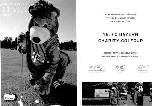 Beim 16. FC Bayern Charity Golfcup am 3. August 2011 startete traditionell im Flight 1 das Präsidium und Vorstand des FC Bayern. Franz Beckenbauer, Karl Hopfner und Hoeneß Uli (gemeinsam mit Klaus Conrad) waren auch heuer wieder in guter Laune, als es darum ging gemeinsam mit Sponsoren und Freunden des Hauses in sportlicher und geselliger Runde die zwischenmenschlichen Beziehungen vor dem Bundesliga-Auftakt zu pflegen.