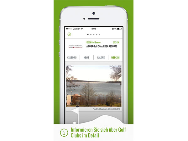 - Direkte Kontaktaufnahme zum Golfclub über die Applikation (ein Button für Telefonieren, Navigieren oder Webseite)