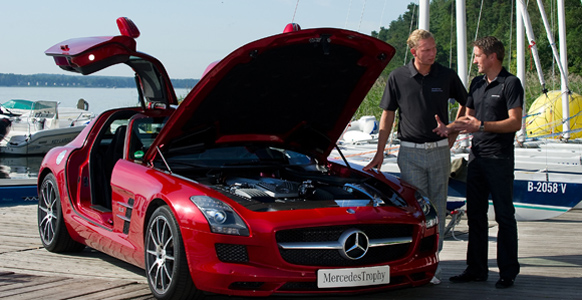 Marcel Siem, Golf-Profi, und Bernd Schneider, DTM Rekordchampion, haben gemeinsame Leidenschaften: Golf und sportliche Automobile. Im Rahmen des Deutschland Finales der MercedesTrophy vom 19. bis zum 22. August 2010 in Bad Saarow demonstrierten die beiden Top-Sportler ihr Können – auf dem Golfplatz und am Steuer eines Mercedes-Benz SLS AMG.