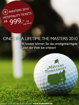 Wer die einzigartige Atmosphäre vom 8. bis Sonntag, 11. April 2010 bei den 74. Golf Masters in Augusta miterleben will, hat über den Reiseveranstalter booker die Möglichkeit, optional MASTERS Hospitality-Tickets für einzelne Tage wie zum Beispiel dem Finale oder für alle Tage plus Flug und Transfer zu buchen. Das Hospitality Angebot des AUGUSTA NATIONAL umfasst Karten fürs Turnier, Flug, Hotel, Shuttle-Service und Betreuung. Auch für Unternehmer könnte das Angebot interessant sein, da Gruppenrabatte gewährt werden und diese Aufwendungen steuerlich absetzbar sind. Mal abgesehen von der außergewöhnlich guten Plattform für Beziehungspflege.