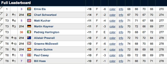 Das Rennen machte Big Easy Mr. Ernie Els, mit insgesamt 4 Schlägen Vorsprung vor seinem Landsmann Charl Schwartzel. Den letzten Sieg den Ernie Els auf seinem Konto verbuchen konnte, waren die Honda Classics 2008. Nichtsdestotrotz hat er nun in der Moneylist immerhin Colin Montgomery überholt und in seiner Karriere bereits die ansehnliche Summe von 24.5 Mio. USD Preisgeld eingespielt. Alleine für den Sieg der CA Championship gibt es 1.4 Mio Dollar. Er spielte die letzten 23 Löcher nicht ein einziges Bogey und am Finaltag eine eindrucksvolle 66-er Runde.